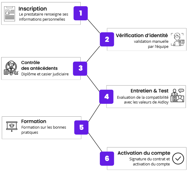 Chez Aidloy, la sécurité et la fiabilité sont notre priorité. Chaque prestataire passe par un processus rigoureux : vérification d’identité, contrôle des antécédents, validation des compétences et Formation.