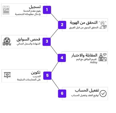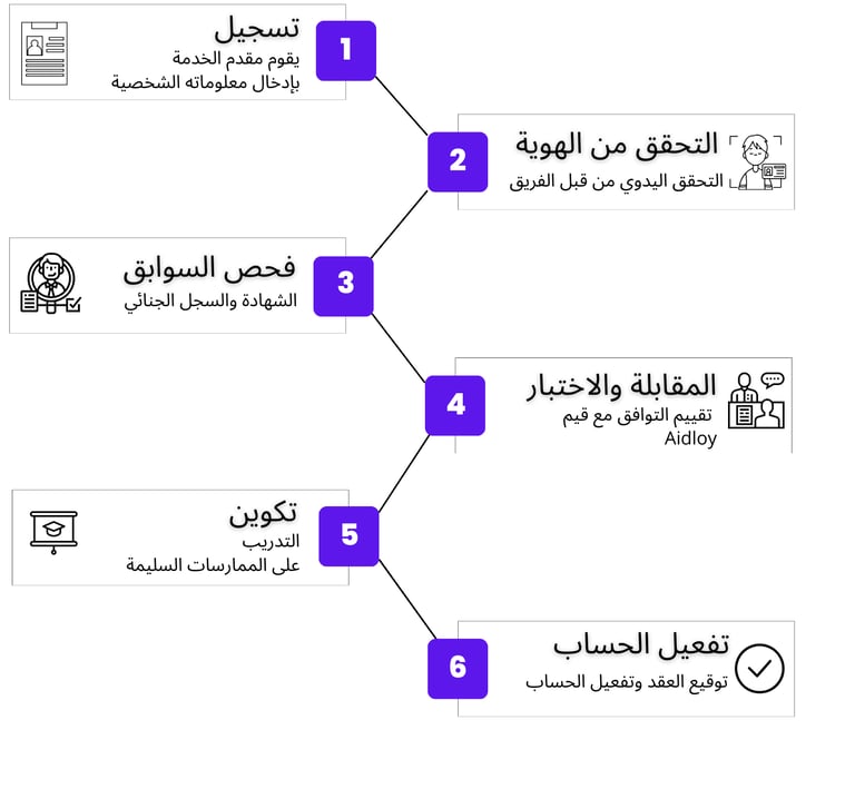 في Aidloy، السلامة والموثوقية هما أولويتنا. يمر كل مقدم خدمة بعملية دقيقة تشمل: التحقق من الهوية، فحص السوابق، اعتماد المهارات والتدريب ولا يمكنهم مرافقة أحبائكم بثقة إلا بعد اجتياز هذه المراحل.