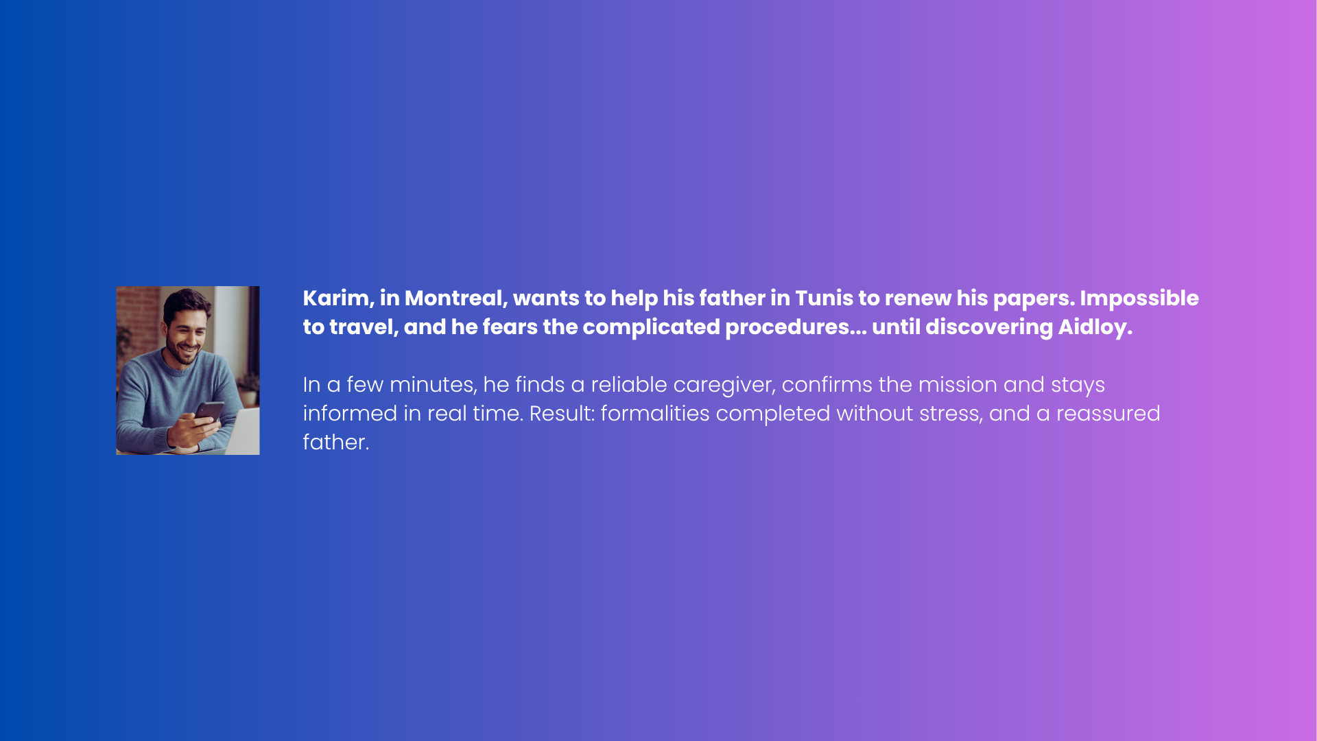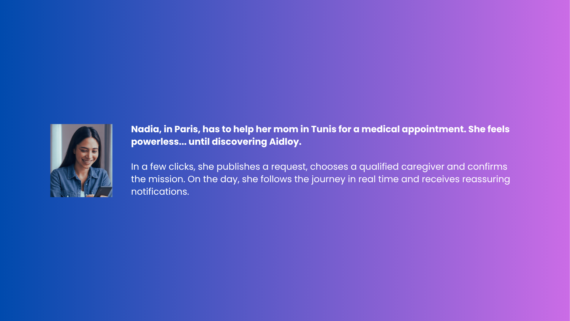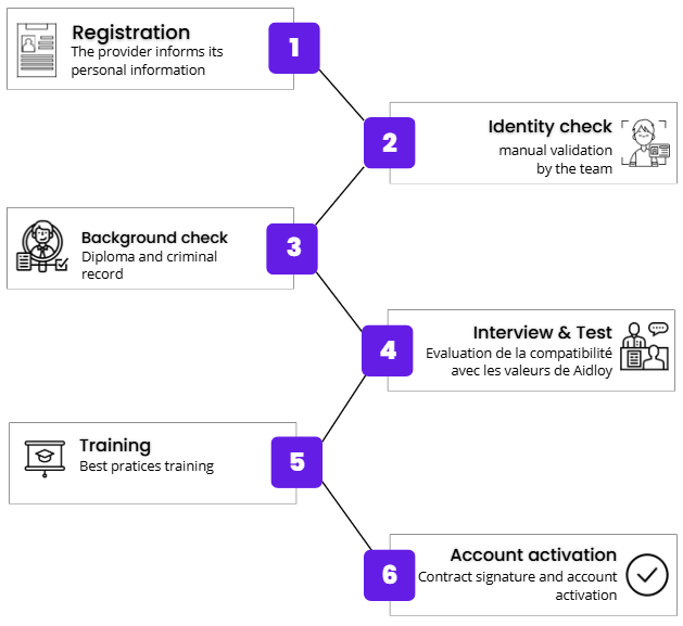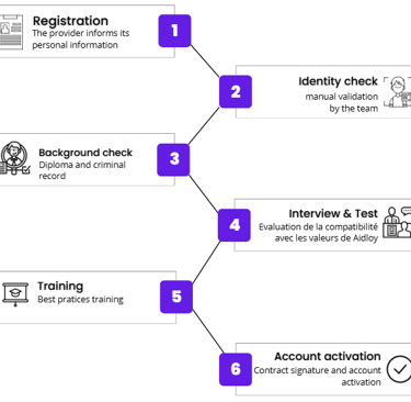 At Aidloy, safety and reliability are our top priority. Each provider goes through a rigorous process: identity verification, background checks, validation of skills and training.